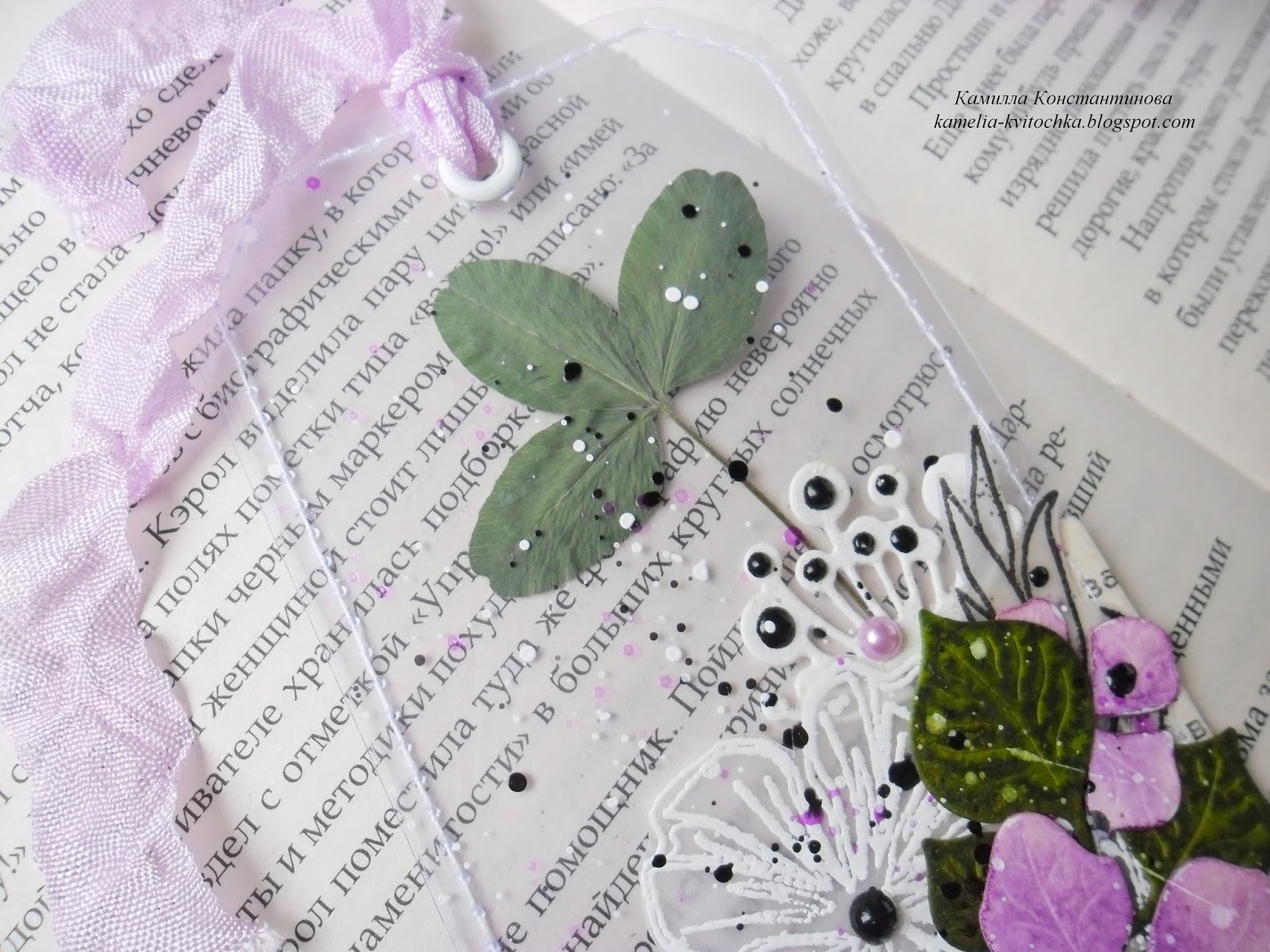 Всем привет) У меня по заданию родилась вот такая закладочка в виде прозрачного тега. Внутри красуется веточка клевера. На лицевой стороне вырубка из листиков и цветочков, а также эмбоссинг на кальке. Дополняют все дотсы, полужемчуг и, конечно же, брызги белым акрилом и деко глазурью - черная и ежевика.